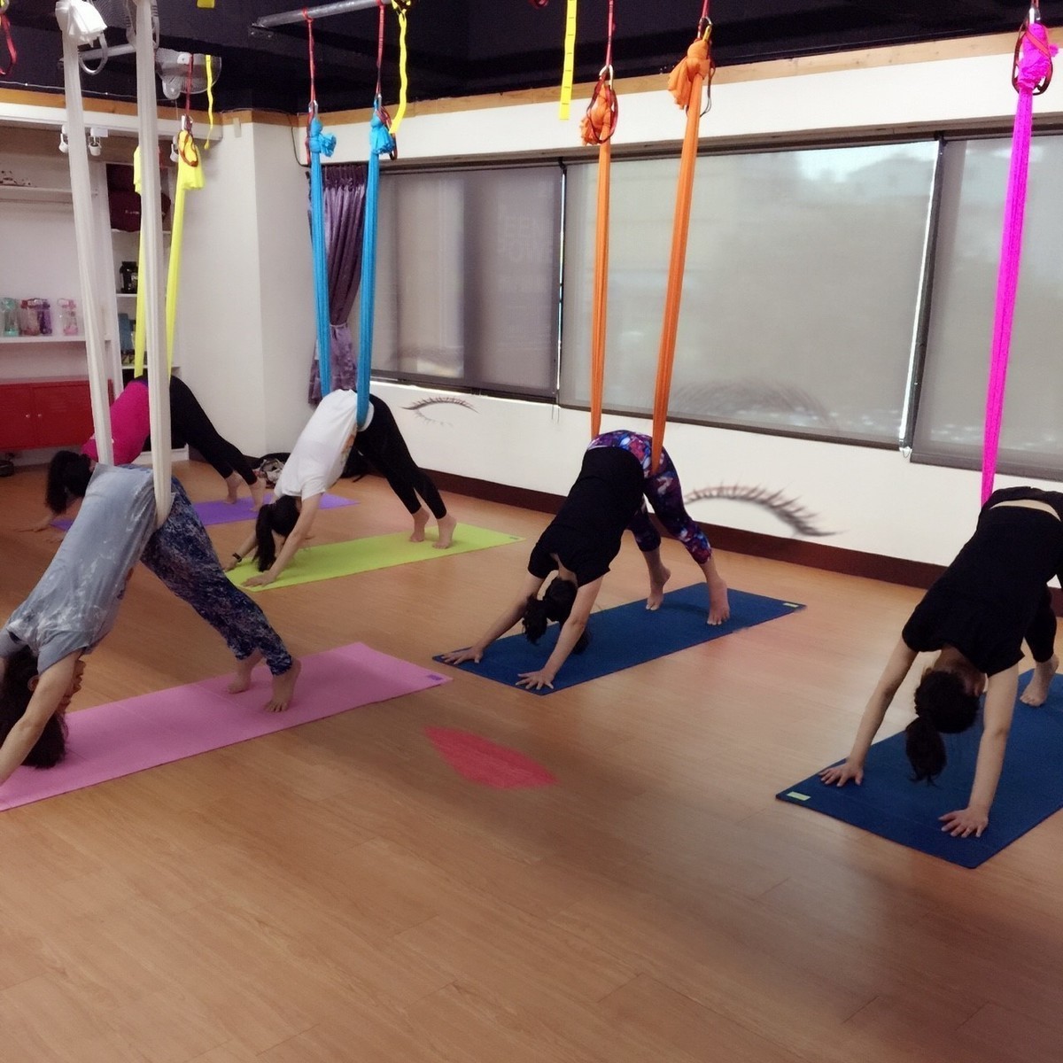 空中瑜珈→空中瑜珈是運用懸垂的絹布,藉助地心引力與布的螺旋力,使平時難以完成的瑜珈動作變得較輕鬆,可幫助練習者提升身體的協調感與肌力。 搭配呼吸以改善體態的不平衡,幫助身體獲得深層的舒展與釋放緊繃壓力。不建議患有高低血壓、心臟病人士和孕婦參與課程,適逢生理期者應避免倒掛的動作練習。