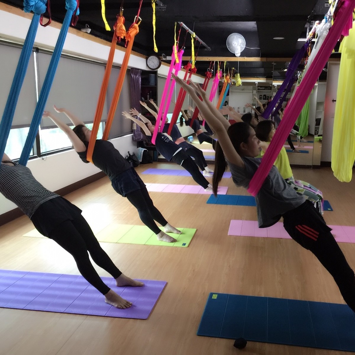 空中瑜珈→空中瑜珈是運用懸垂的絹布,藉助地心引力與布的螺旋力,使平時難以完成的瑜珈動作變得較輕鬆,可幫助練習者提升身體的協調感與肌力。 搭配呼吸以改善體態的不平衡,幫助身體獲得深層的舒展與釋放緊繃壓力。不建議患有高低血壓、心臟病人士和孕婦參與課程,適逢生理期者應避免倒掛的動作練習。